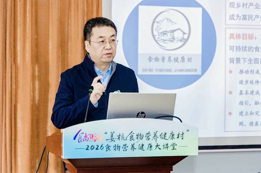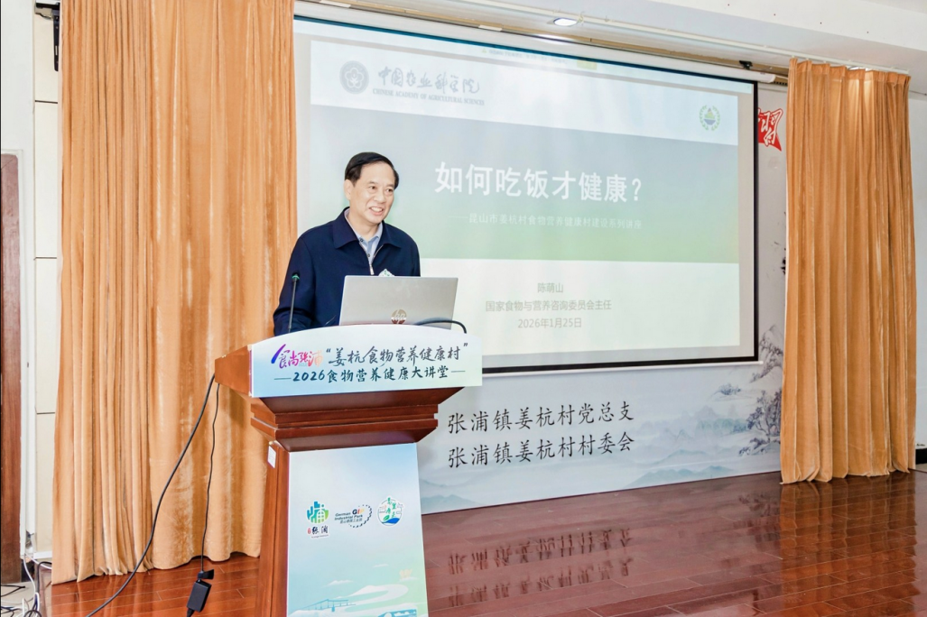 2026年1月25日,食尚张浦“姜杭食物营养健康村”健康大讲堂暨2026年工作推进会在苏州昆山张浦镇姜杭村举行。该项目由由中国农业科学院农业经济与发展研究所乡村治理与发展团队、中农院苏州华东中心、张浦镇人民政府、姜杭村合作开展。此次活动旨在传播食物营养健康理念,总结试点进展、凝聚建设共识、明确发展路径,为探索以人的生命健康为主题、多元主体参与的乡村全面振兴提供有力支撑。中国农业科学院原党组书记、国家食物与营养咨询委员会主任、中农院苏州华东中心战略委员会主任陈萌山研究员,中国农业科学院农业经济与发展研究所乡村治理与发展团队首席、中农院苏州华东中心乡村治理团队首席赵一夫研究员,农业农村部食品与营养发展研究所、中国农业科学院双蛋白工程技术研究中心主任王靖研究员,农业农村部食品与营养发展研究所食物与营养战略创新团队首席徐海泉研究员以及各团队相关成员,昆山市农业农村局党委委员、市乡村振兴局副局长徐学新,张浦镇副镇长顾亚平,姜杭村党总支书记姚娅婧,中农院苏州华东中心、昆山市第六人民医院、中国电信、益海嘉里、润正生物等相关单位代表,以及姜杭村村民代表参加了此次活动。