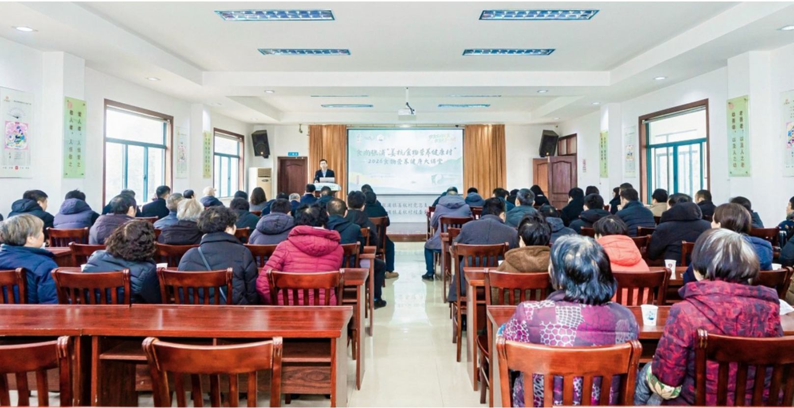 陈萌山书记为姜杭村村民作了《如何吃饭才健康》专题讲座。他生动阐释了吃好饭对健康的重要作用,强调需均衡摄取碳水化合物、脂肪、蛋白质、维生素、矿物质、膳食纤维和水七类营养素,介绍了科学膳食的七项具体原则。他强调人民健康对国家、民族具有重要意义,向村民发出了“吃好饭健康活到老”的倡议。