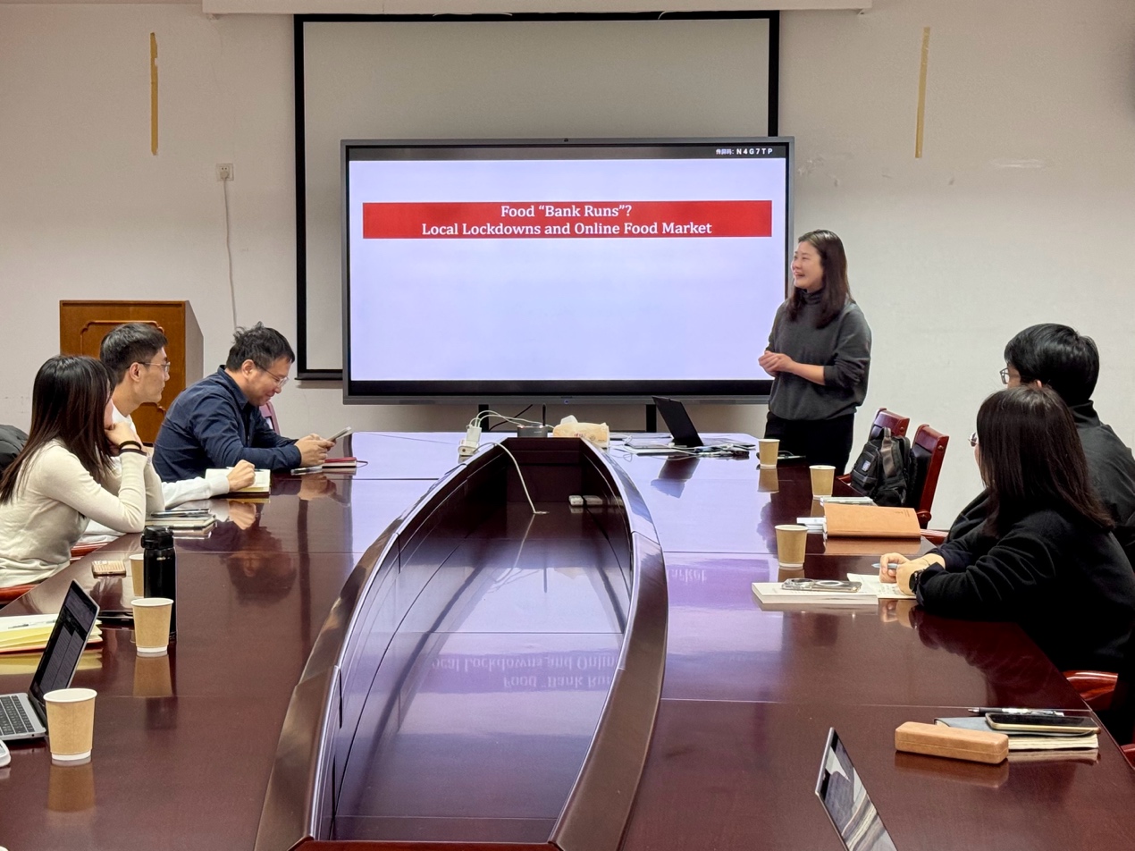 报告中,林雯研究员聚焦市场需求侧预期变化对农食系统稳定性的影响,利用局部公共卫生政策和全量线上交易数据揭示消费预期如何引发市场类“挤兑现象”。她指出,政策不仅直接影响政策区域的市场均衡,还通过预期溢出效应推高邻近区域的交易规模与农食产品价格,体现市场预期在农食系统稳定中的重要作用。最后,林雯研究员还进一步讨论了在我国建设统一大市场和扩大内需背景下,需求侧预期对农食系统韧性的影响及其治理启示。在互动环节中,参会师生围绕消费数据、因果识别策略、研究选题等问题进行了深入交流与讨论。
