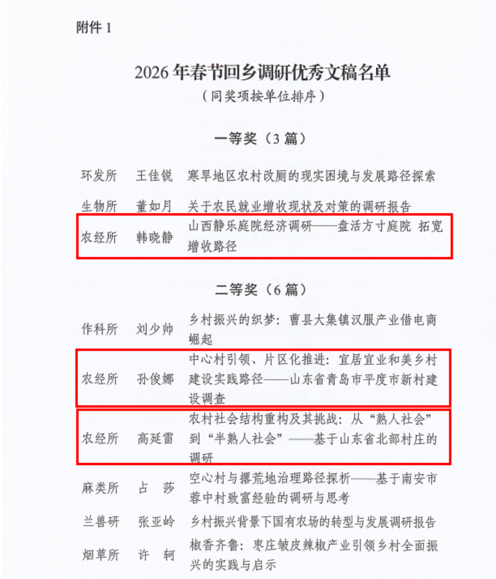 农经所积极响应部院团委部署要求,组织青年干部利用春节返乡契机,围绕贯彻落实党的二十届四中全会精神和部院党组重点工作,聚焦乡村产业、乡村建设、乡村治理、农民增收等“三农”领域热点难点问题,深入田间地头、走村入户开展实地调研。本次获奖的调研成果小切口、接地气、有情况、有研究、真思考、带感情,充分展现了农经所青年干部“把论文写在祖国大地上、把科研做在乡村振兴一线”的使命担当。