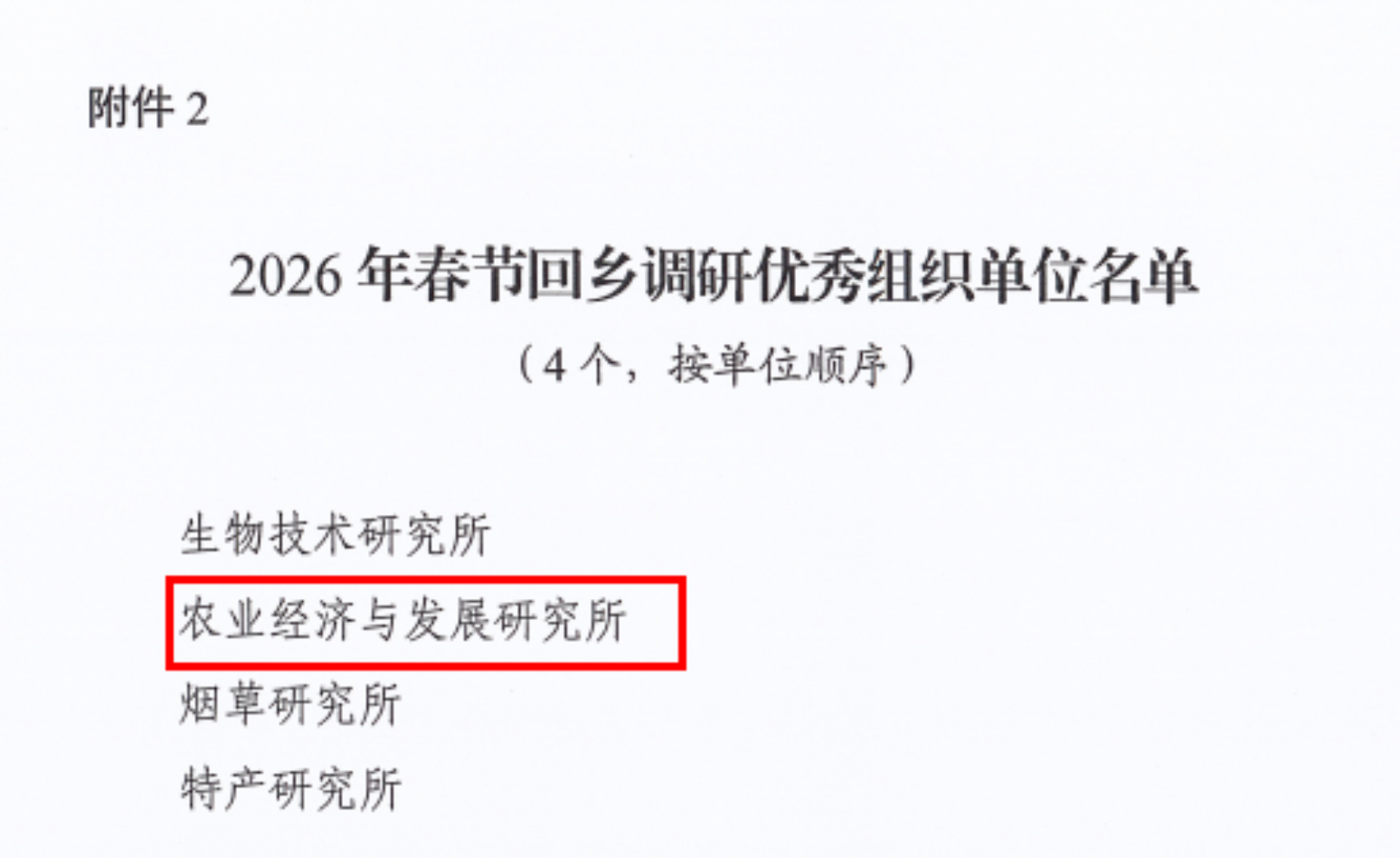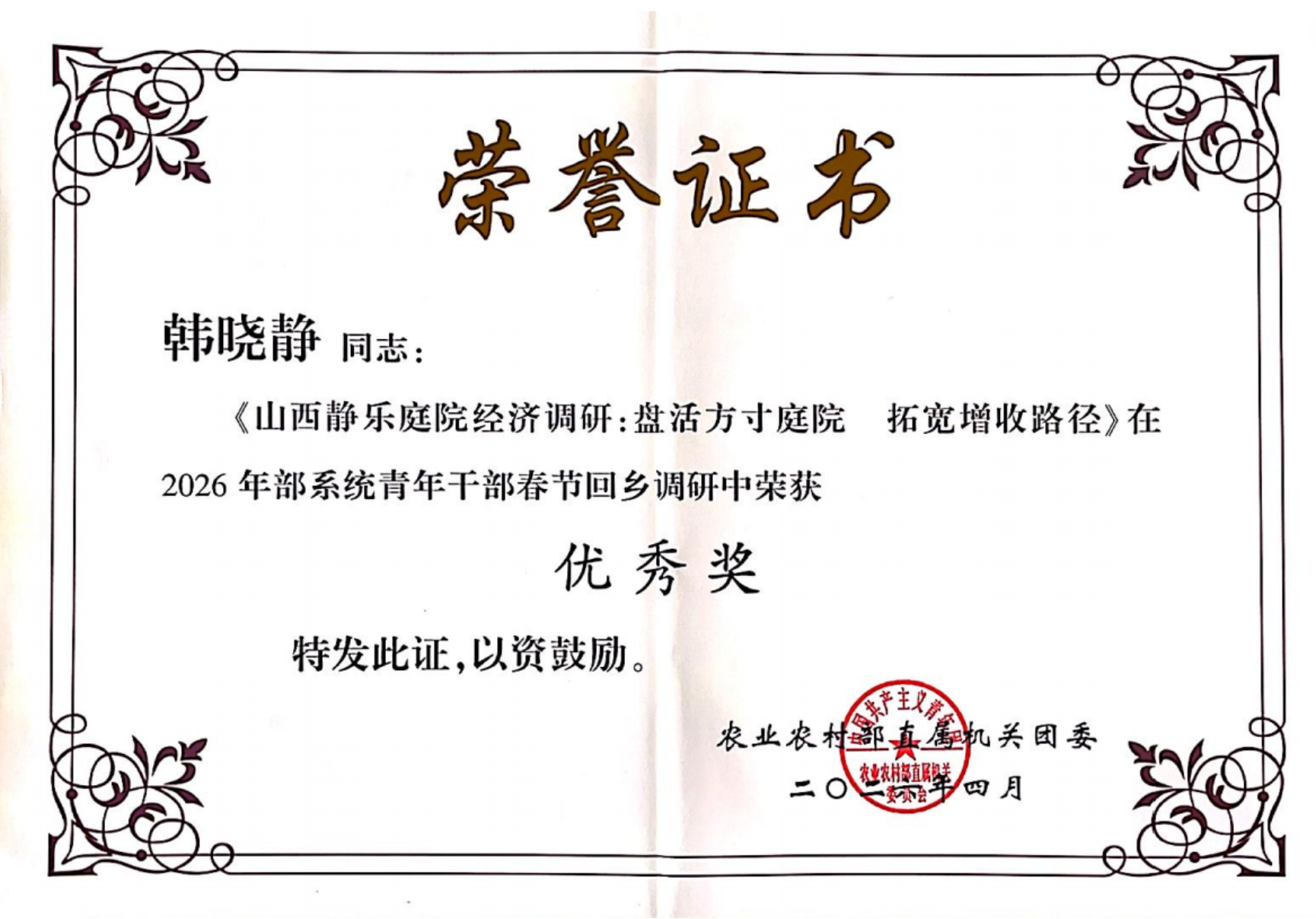 近日,中国农业科学院团委对2026年青年干部春节回乡调研情况进行了通报。农经所获“优秀组织单位”称号,韩晓静、孙俊娜、高延雷、鄢朝晖、丁琳琳五位青年干部分别获得一、二、三等奖,其中韩晓静《山西静乐庭院经济调研:盘活方寸庭院 拓宽增收路径》获评2026年农业农村部系统青年干部春节回乡调研优秀奖。